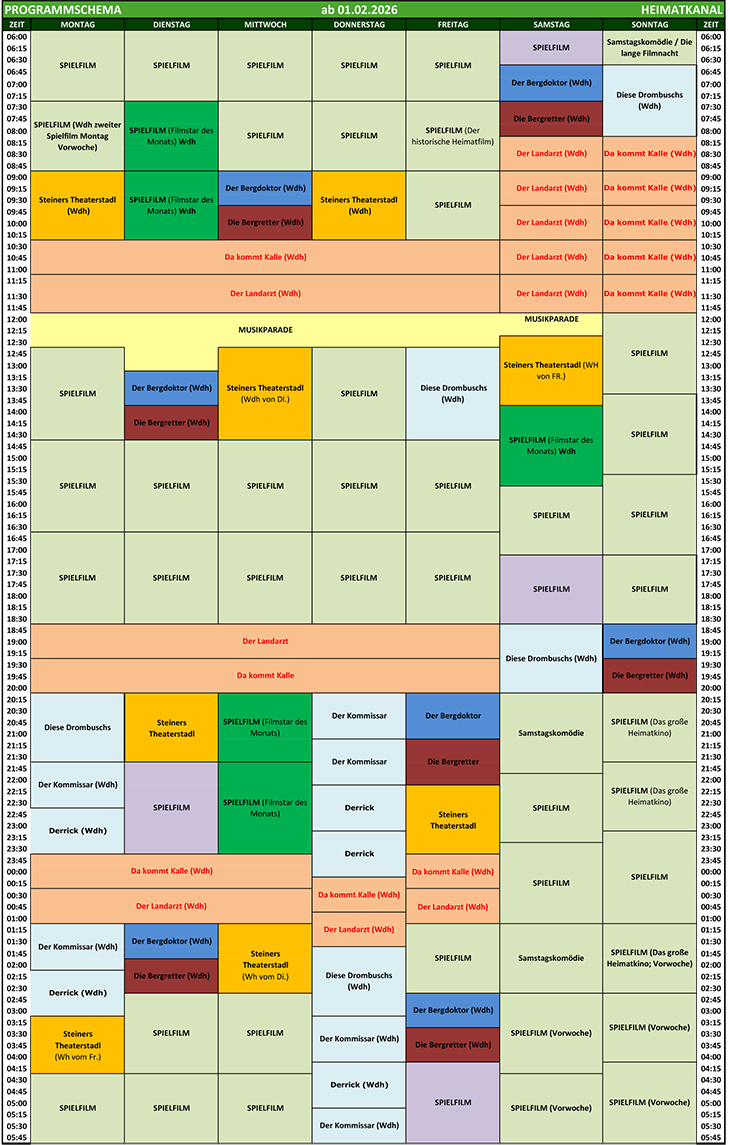Sie können hier die aktuellen Programmschemata der drei Pay-TV-Sender Heimatkanal und Romance TV und GoldStar TV downloaden und einsehen.